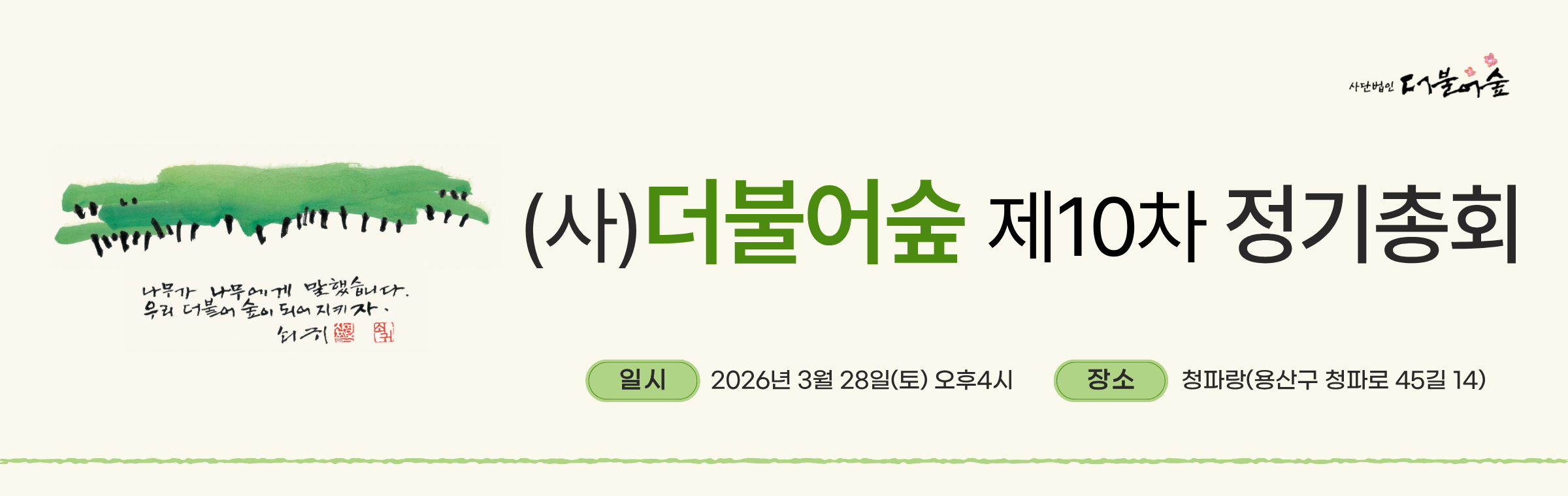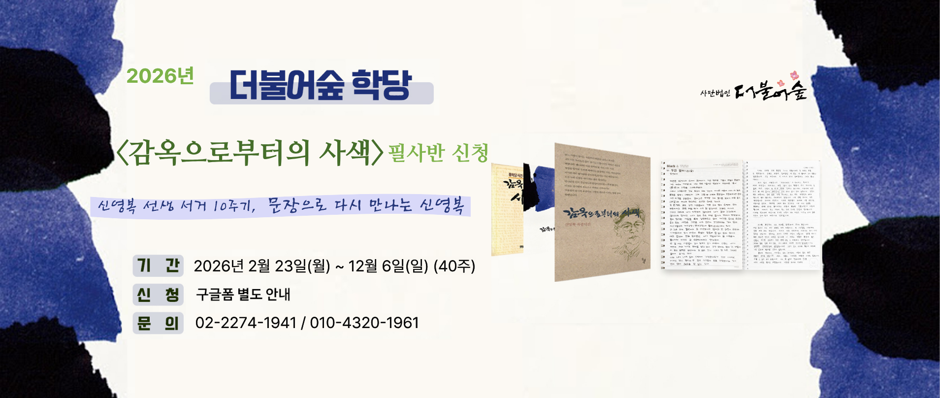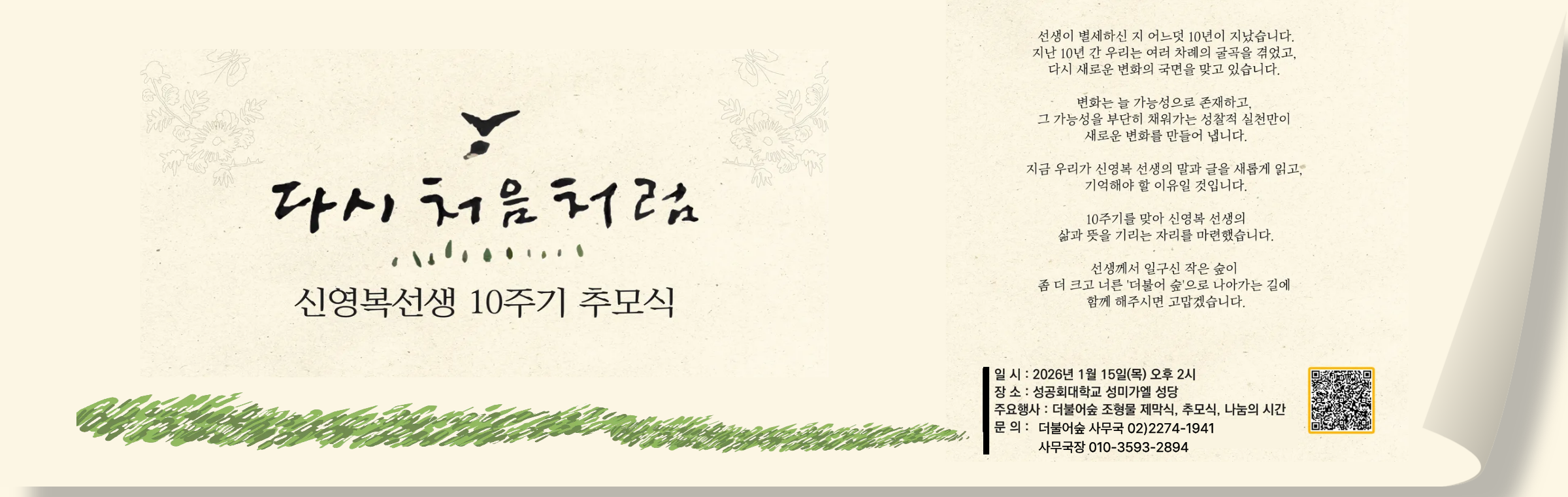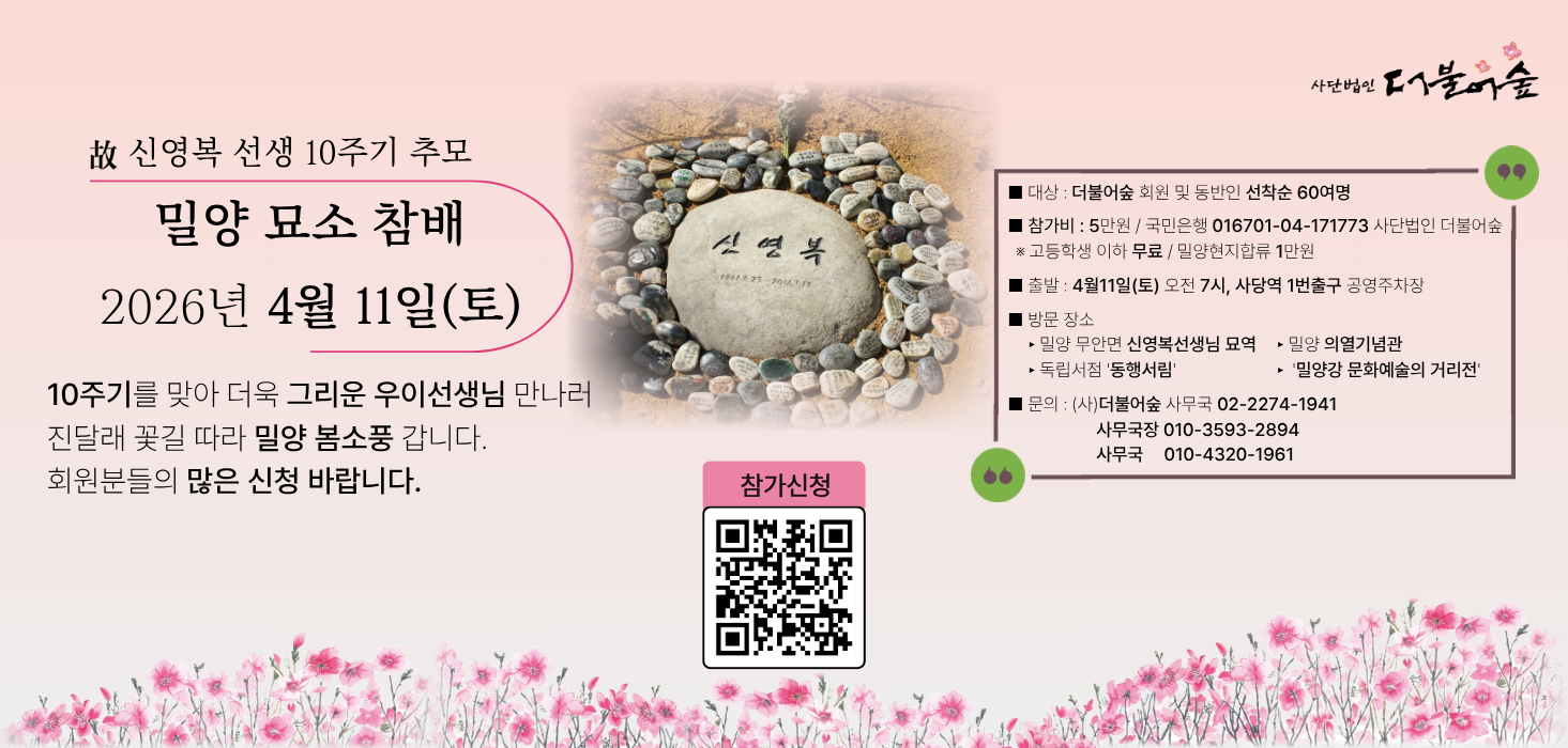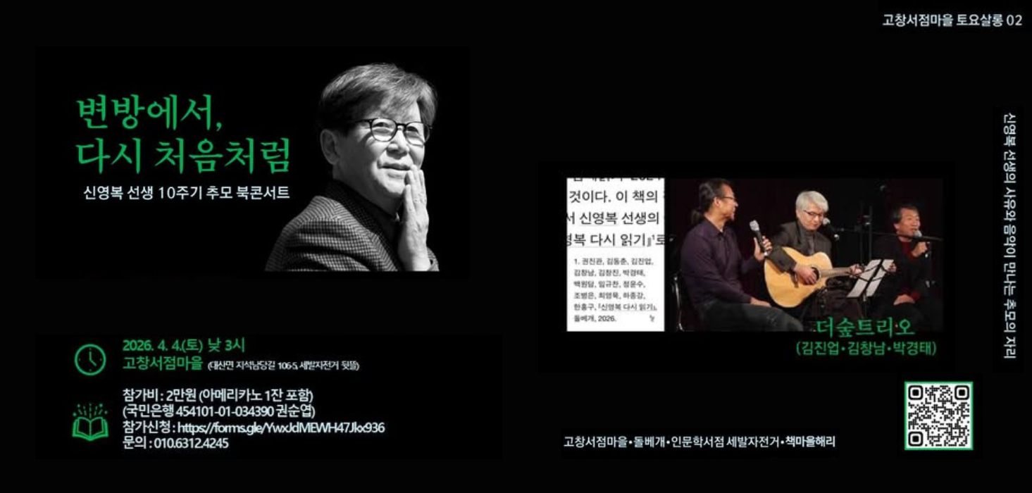신영복선생 10주기 추모 북콘서트 안내 - 고창서점마을 토요살롱 02 신영복 선생 10주기 추모 북콘서트 "변방에서, 다시 처음처럼" 신영복 선생의 사유와 음악이 만나는 추모의 자리에 초대합니다. 이번 북콘서트는 신영복 선생 10주기를 맞아, 선생이 평생 서 있었던 ‘변방’의 자리에서 오늘의 우리에게 다시 ‘처음처럼’을 묻는 시간입니다. 신영복 선생이 남긴 말과 글, 그리고 음악이 어우러진 무대를 통해 선생의 사유와 삶의 태도를 되새기며, 지금 이 시대에 필요한 성찰과 연대의 의미를 함께 나눕니다. ■ 일시 : 2026년 04월 4일(토) 낮 3시 ■ 장소 : 고창서점마을 인문학서점 세발자전거 뒷뜰 (대산면 지석남당길 106-5) ■ 공동주최 : 고창서점마을, 돌베개, 인문학서점 세발자전거, 책마을해리 ◦참가비 : 2만원 (아메리카노 1잔 포함) ◦입금 : 국민은행 454101-01-034390 (권순엽) ◦참가신청 : https://forms.gle/YwxJdMEWH47Jkx936 ◦문의 : 010-6312-4245 *** 결재까지 완료된 신청자분들은 프로그램 2일 전까지 안내문자가 발송됩니다. *** 당일 취소 혹은 불참 시 참가비는 돌려드리지 않습니다. ■ 출연진 소개 : 더숲트리오(The Forest Trio) 더숲트리오는 학자이자 음악인인 세 명의 성공회대학교 교수(김진업, 김창남, 박경태)로 구성된 포크·어쿠스틱 밴드입니다. 삶과 연대, 평화와 성찰의 메시지를 노래하며, 신영복 선생과 함께한 여러 북콘서트 무대에 서서 따뜻한 공감과 울림을 전해 왔습니다. ★ 더불어숲 회원분들의 많은 관심과 참여를 부탁드립니다. #신영복10주기 #북콘서트 #더숲트리오 #고창서점마을 #돌베개 #인문학서점세발자전거 #책마을해리 #더불어숲 #신영복 #신영복선생님