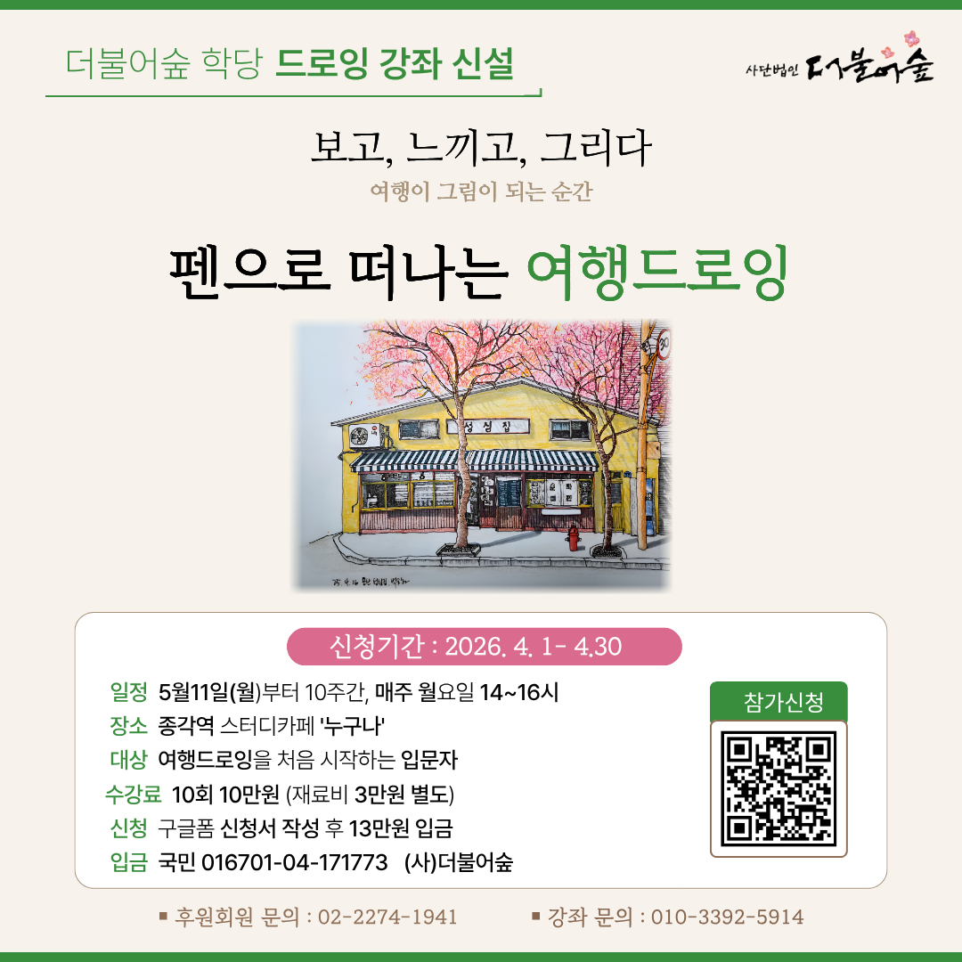 2026년 새롭게 시작되는 더불어숲학당의 드로잉 강좌에 함께 하실 분들을 기다립니다.