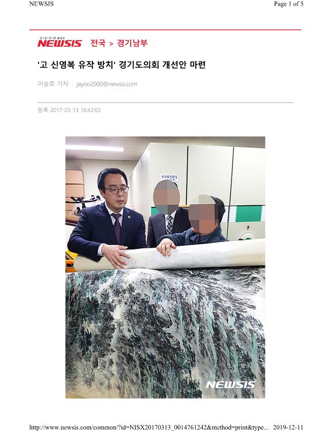 경기도의회가 청사 내 창고(문서고)에 방치한 고(故) 신영복 교수의 유작 등 미술품을 전시할 별도의 공간을 마련하기로 했다. <뉴시스 3월12일자 보도> 도의회 정기열(더불어민주당·안양4) 의장은 13일 오후 청사 지하 1층 창고를 찾아 방치된 미술품 실태를 확인했다. 창고에는 '처음처럼'의 글씨체(쇠귀체)를 만들었던 주인공인 고 신 교수의 유작 '사람중심 민생중심 의회구현' 글씨가 여전히 아무렇게나 쌓인 책걸상 틈에 놓여 있었다. 또 한국화 명인 설봉 기노철 화백이 2008년 6월 기증한 가로세로 370㎝×140㎝짜리의 산수화 '청산청아 목류수정아이'도 돌돌 말린 채 의자 위에 올려져 있었다. 정 의장이 산수화를 펼치자, 색이 바랜 채 곳곳이 찢어져 있었다. 정 의장은 방치된 작품들을 확인한 뒤 "의회가 보유한 귀한 작품들"이라며 "활용 방안을 찾아야 한다. 의장실로 우선 옮긴 뒤 청사 2·3층에 전시실을 마련하라"고 사무처에 지시했다. 그는 또 의회가 보유한 작품 설명과 목록을 재작성할 것도 주문했다. associate_pic 【수원=뉴시스】이승호 기자 = 경기도의회 정기열(더불어민주당·안양4) 의장이 13일 오후 도의회 청사 지하 1층 창고를 찾아 의자 틈에 방치돼 있던 고(故) 신영복 교수의 유작 '사람중심 민생중심 의회구현' 글씨를 꺼내고 있다.2017.03.13. jayoo2000@newsis.com 앞서 뉴시스 보도로 도의회가 고 신 교수의 유작 등을 창고에 내동댕이친 사실이 알려지자, 비난 여론이 쏟아졌다. 인터넷에는 '혼이 깃든 작품을 저리 때 지난 달력 취급하다니. 진짜 한심하다'(글쓴이 김동무), '신영복 선생 글씨와 서체가 아깝다'(아크로), '잿밥에만 눈이 어두운 자들이 무슨 예술품에 관심이나 있겠나'(순수) 등의 거센 비난 글이 올려졌다. 고 신 교수는 암 투병 와중인 2015년 10월 도의회가 첫 현판 글씨 작성을 요청하자, 아픈 몸을 이끌고 밤샘 작업 끝에 도의회에 2개의 글씨를 건네고 2개월 뒤 숨을 거뒀다. 도의회는 고인의 글씨 가운데 하나를 현판으로 제작하고 원본을 의장실에 걸었지만, 또 다른 하나는 창고 의자 틈에 방치했다. 도의회는 이 밖에도 유명 작가로부터 기증받은 백자·청자 등의 도자기 6점도 별도 보관 없이 창고 철제 선반 위에 아슬아슬하게 올려 놨다. 10년 넘게 의장 접견실을 장식했던 대형 '백두산 사진'은 잃어버리기까지 했다. jayoo2000@newsis.com 뉴시스