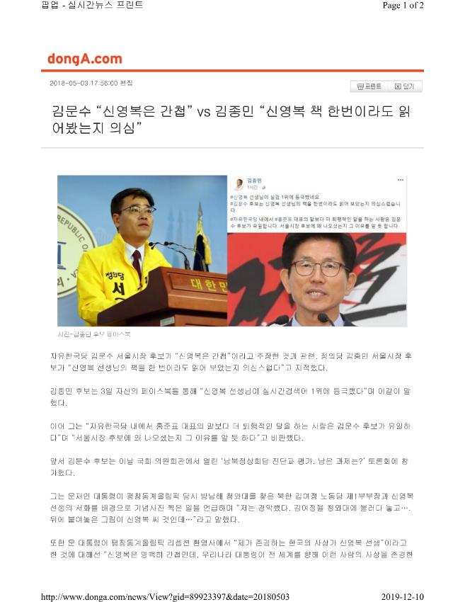 자유한국당 김문수 서울시장 후보가 “신영복은 간첩”이라고 주장한 것과 관련, 정의당 김종민 서울시장 후보가 “신영복 선생님의 책을 한 번이라도 읽어 보았는지 의심스럽다”고 지적했다. 김종민 후보는 3일 자신의 페이스북을 통해 “신영복 선생님이 실시간검색어 1위에 등극했다”며 이같이 말했다. 이어 그는 “자유한국당 내에서 홍준표 대표의 말보다 더 퇴행적인 말을 하는 사람은 김문수 후보가 유일하다”며 “서울시장 후보에 왜 나오셨는지 그 이유를 알 듯 하다”고 비판했다. 앞서 김문수 후보는 이날 국회 의원회관에서 열린 ‘남북정상회담 진단과 평가, 남은 과제는?’ 토론회에 참가했다. 그는 문재인 대통령이 평창동계올림픽 당시 방남해 청와대를 찾은 북한 김여정 노동당 제1부부장과 신영복 선생의 서화를 배경으로 기념사진 찍은 일을 언급하며 “저는 경악했다. 김여정을 청와대에 불러다 놓고…. 뒤에 붙여놓은 그림이 신영복 씨 것인데…”라고 말했다. 또한 문 대통령이 평창동계올림픽 리셉션 환영사에서 “제가 존경하는 한국의 사상가 신영복 선생”이라고 한 것에 대해선 “신영복은 명백히 간첩인데, 우리나라 대통령이 전 세계를 향해 이런 사람의 사상을 존경한다는 말을 하면 안 된다고 생각한다”고 주장했다. 그러면서 “이런 사람(신영복 선생)의 사상을 우리가 배격하고 배제해야 하는데 대통령이 전 세계를 향해서 앞장서서 존경한다고 하면 대한민국이 어떻게 되는 것인가”라고 말하기도 했다. 한편, 신영복 선생은 1968년 통일혁명당 사건으로 무기징역을 선고받아 20년간 복역하다가 1988년 8월 15일 특별가석방으로 출소했다.군사정권 시절의 많은 사상범이 민주화 이후 재심을 통해 무죄를 선고받았지만 신영복은 재심을 청구하지 않았다. 이후 성공회대 교수로 강의와 작품활동을 이어오다가 2016년 1월 15일 별세했다 동아닷컴