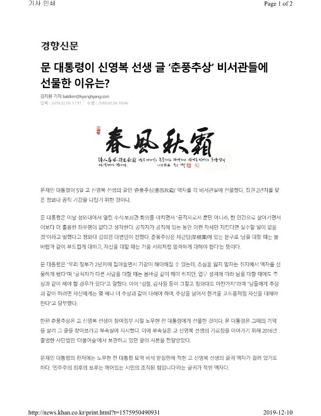 [기사] 문대통령이 신영복 선생 글 ‘춘풍추상’ 비서관들에 선물한 이유는?