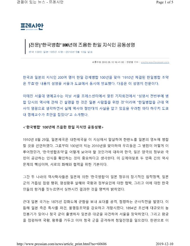 한국과 일본의 지식인 200여 명이 한일 강제병합 100년을 맞아 '1910년 체결된 한일병합 조약은 무효'란 내용의 성명을 서울과 도쿄에서 동시에 발표했다. 다음은 이 성명의 전문이다. 이태진 서울대 명예교수는 이날 서울 프레스센터에서 열린 기자회견에서 "성명서 전반부에 병합 당시의 역사에 관해 긴 설명을 한 것은 일본 사람들을 위한 것"이라며 "한일병합을 근대 역사의 영광으로 생각하면서 실제 역사와 정반대의 사실을 알고 있음을 우려한 와다 하루키 도쿄대 명예교수가 초안을 잡았다"고 소개했다. <'한국병합' 100년에 즈음한 한일 지식인 공동성명> 1910년 8월 29일, 일본제국은 대한제국을 이 지상에서 말살하여 한반도를 일본의 영토에 병합할 것을 선언하였다. 그로부터 100년이 되는 2010년을 맞이하여 우리들은 그 병합이 어떻게 이루어졌던가, '한국병합조약'을 어떻게 보아야 할 것인가에 대하여 한국, 일본 양국의 정부와 국민이 공감하는 인식을 확인하는 것이 중요하다고 생각한다. 이 문제야말로 두 민족 간의 역사문제의 핵심이며, 서로의 화해와 협력을 위한 기본이다. 그간 두 나라의 역사학자들은 일본에 의한 '한국병합'이 일본 정부의 장기적인 침략정책, 일본군의 거듭된 점령 행위, 명성왕후 살해와 국왕과 정부요인에 대한 협박, 그리고 이에 대한 한국인들의 항거를 짓누르면서 실현시킨 결과란 것을 명백히 밝히었다. 근대 일본 국가는 1875년 강화도에 군함을 보내 포대를 공격, 점령하는 군사작전을 벌였다. 이듬해 일본 측은 특사를 파견, 불평등조약을 강요하고 개항시켰다. 1894년 조선에 대규모의 농민봉기가 일어나 청국 군이 출병하자 일본은 대군을 파견하여 서울을 장악하였다. 그리고 왕궁을 점령하여 국왕, 왕후를 가두고 이어 청국 군을 공격하여 청일전쟁을 일으켰다. 한편으로 이에 대항하는 한국의 농민군을 무력으로 진압하였다. 청일전쟁의 승리로 일본은 청국세력을 한국에서 몰아내는 데 성공하였지만 삼국간섭(三國干涉)으로 승전의 대가로 획득한 요동반도를 되돌려 놓게 되었다. 이런 결과에 부딪혀, 일본은 그간 한국에서 확보한 지위마저 잃게 될 것을 우려하여 국왕에게 공포감을 주고자 왕비 민씨를 살해하였다. 국왕 고종이 러시아 공사관에 보호를 구하게 되자 일본은 러시아와 협상을 통해 사태를 수습하려 들게 되었다. 그러나 의화단(義和團) 사건으로 러시아가 만주를 점령하게 된 후, 1903년에 일본은 그 대신 한국 전토를 일본의 보호국으로 하는 것을 인정할 것을 러시아에 요구하였다. 러시아가 이를 거절하자, 일본은 전쟁을 결심하고 1904년 전시(戰時) 중립을 선언한 대한제국에 대규모의 군대를 진입시켜 서울을 점령하였다. 그 점령군의 압력 하에 2월 23일 한국 보호국화의 제1보가 된 '의정서'의 조인을 강요하였다. 러일전쟁은 일본의 우세승으로 결말이 나고, 일본은 포츠머드강화조약에서 러시아로 하여금 한국에 대한 일본의 지배를 인정하게 하였다. 이토 히로부미(伊藤博文)는 곧바로 천황의 특사로 서울로 와서 일본군의 힘을 배경으로 위협과 회유를 번갈아 1905년 11월 18일에 외교권을 박탈하는 '제2차 한일협약'을 체결시켰다. 의병운동이 각지에서 일어나는 가운데 고종황제(高宗皇帝)는 이 협약은 강제된 것으로 효력이 없다는 친서를 각국 원수(元首)들에게 보내었다. 1907년 헤이그 평화회의에 특사를 보낸 일로, 통감 이토 히로부미는 이에 대한 고종황제의 책임을 물어 그의 퇴위를 강요하고 군대를 해산시켰다. 이와 동시에 7월 24일에 '제3차 한일협정'를 강요하여 한국의 내정에 대한 감독권도 장악하였다. 이러한 일본의 침략에 대하여 의병운동이 크게 일어났지만, 일본은 군대, 헌병, 경찰의 힘으로 탄압하다가 1910년에 '한국병합'을 단행하게 되었던 것이다. 이상과 같이 '한국병합'은 대한제국의 황제로부터 민중에 이르기까지 모든 사람의 격렬한 항의를 군대의 힘으로 짓누르고 실현시킨, 문자 그대로 제국주의 행위이며, 불의부정(不義不正)한 행위였다. 일본국가의 '한국병합' 선언은 1910년 8월 22일의 병합조약에 근거하여 설명되고 있다. 이 조약의 전문(前文)에는 일본과 한국의 황제가 두 나라의 친밀한 관계를 바라고, 상호의 행복과 동양 평화의 영구 확보를 위해서는 '한국을 일본제국에 병합하는 것 만한 것이 없다'고 하여 병합이 최선이라고 확신하고, 본 조약을 체결하기에 이르렀다고 서술되어 있다. 그리고 제1조에 '한국 황제 폐하는 한국 전부(全部)에 관한 일체의 통치권을 완전하고 또 영구히 일본국 황제 폐하에게 양여(讓與)한다'고 기술하고, 제2조에 '일본국 황제 폐하는 전조(前條)에 서술되어 있는 양여를 수락하고 또 전적으로 한국을 일본제국에 병합하는 일을 승낙한다.'고 적고 있다. 여기서 힘으로 민족의 의지를 짓밟은 병합의 역사적 진실은, 평등한 양자의 자발적 합의로, 한국 황제가 일본에 국권 양여를 신청하여 일본천황이 그것을 받아들여, '한국병합'에 동의했다고 하는 신화로 덮어 숨기고 있다. 조약의 전문(前文)도 거짓이고 본문도 거짓이다. 조약 체결의 절차와 형식에도 중대한 결점과 결함이 보이고 
