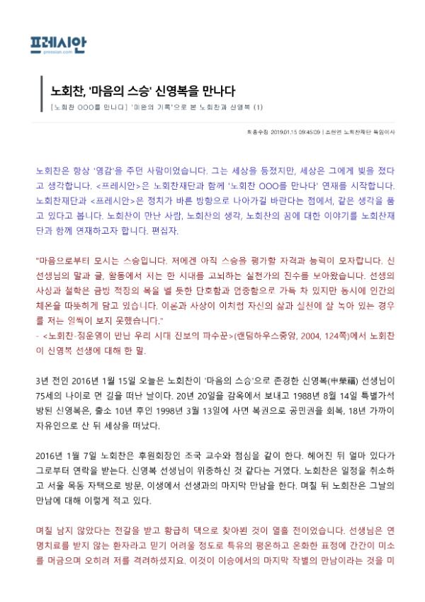 노회찬, '마음의 스승' 신영복을 만나다 [노회찬 OOO를 만나다] '미완의 기록'으로 본 노회찬과 신영복 (1) 조현연 노회찬재단 특임이사 2019.01.15 09:45:09 노회찬은 항상 '영감'을 주던 사람이었습니다. 그는 세상을 등졌지만, 세상은 그에게 빚을 졌다고 생각합니다. <프레시안>은 노회찬재단과 함께 '노회찬 OOO를 만나다' 연재를 시작합니다. 노회찬재단과 <프레시안>은 정치가 바른 방향으로 나아가길 바란다는 점에서, 같은 생각을 품고 있다고 봅니다. 노회찬이 만난 사람, 노회찬의 생각, 노회찬의 꿈에 대한 이야기를 노회찬재단과 함께 연재하고자 합니다. 편집자. "마음으로부터 모시는 스승입니다. 저에겐 아직 스승을 평가할 자격과 능력이 모자랍니다. 신 선생님의 말과 글, 활동에서 저는 한 시대를 고뇌하는 실천가의 진수를 보아왔습니다. 선생의 사상과 철학은 금방 적장의 목을 벨 듯한 단호함과 엄중함으로 가득 차 있지만 동시에 인간의 체온을 따뜻하게 담고 있습니다. 이론과 사상이 이처럼 자신의 삶과 실천에 잘 녹아 있는 경우를 저는 일찍이 보지 못했습니다." - <노회찬-정운영이 만난 우리 시대 진보의 파수꾼>(랜덤하우스중앙, 2004, 124쪽)에서 노회찬이 신영복 선생에 대해 한 말. 3년 전인 2016년 1월 15일 오늘은 노회찬이 '마음의 스승'으로 존경한 신영복(申榮福) 선생님이 75세의 나이로 먼 길을 떠난 날이다. 20년 20일을 감옥에서 보내고 1988년 8월 14일 특별가석방된 신영복은, 출소 10년 후인 1998년 3월 13일에 사면 복권으로 공민권을 회복, 18년 가까이 자유인으로 산 뒤 세상을 떠났다. 2016년 1월 7일 노회찬은 후원회장인 조국 교수와 점심을 같이 한다. 헤어진 뒤 얼마 있다가 그로부터 연락을 받는다. 신영복 선생님이 위중하신 것 같다는 거였다. 노회찬은 일정을 취소하고 서울 목동 자택으로 방문, 이생에서 선생과의 마지막 만남을 한다. 며칠 뒤 노회찬은 그날의 만남에 대해 이렇게 적고 있다. 며칠 남지 않았다는 전갈을 받고 황급히 댁으로 찾아뵌 것이 열흘 전이었습니다. 선생님은 연명치료를 받지 않는 환자라고 믿기 어려울 정도로 특유의 평온하고 온화한 표정에 간간이 미소를 머금으며 오히려 저를 격려하셨지요. 이것이 이승에서의 마지막 작별의 만남이라는 것을 미루어 짐작하면서도 선생님은 걱정 말라고 더 건강해지겠노라고 약속하셨고, 저도 다시 뵙겠다며 평소처럼 헤어졌습니다. 그 후 마음의 준비를 했습니다만, 막상 비보를 접하니 가슴이 무너지는 느낌입니다. 언젠가 한번은 가는 길이라지만 선생님! 어찌 그리 바삐 가시려 합니까? 선생님께선 같은 시대를 살아가는 많은 사람들에게 마음으로부터의 큰 스승이셨습니다(경향신문, 2018.1.18.). 다가오는 헤어짐의 시간, 안타까움과 그리움을 트위터에 헤어짐의 시간이 점점 더 다가오고 있는 것을 직감했는지, 사흘 뒤인 1월 10일 밤 노회찬은 트위터에 신영복의 시화 여덟 작품을 잇따라 올리는 것으로 "마음의 스승"에 대한 안타까움과 그리움을 표한다. <2016년 1월 10일 오후 10시 3분 트위터> 밤이 깊을수록 별이 더욱 빛난다는 사실은 힘겹게 살아가는 모든 사람들의 위로입니다. 몸이 차가울수록 정신은 더욱 맑아지고 길이 험할수록 함께 걸어갈 길벗을 더욱 그리워합니다. <오후 10시 9분 트위터> 참된 자유(自由)는 자기(自己)의 이유(理由)를 갖는 것입니다. -신영복 <오후 10시 12분 트위터> 배운다는 것은 자기를 낮추는 것입니다. 가르친다는 것은 다만 희망에 대하여 이야기하는 것입니다. 사랑한다는 것은 서로 마주보는 것이 아니라 같은 곳을 함께 바라보는 것입니다. -신영복 <오후 10시 26분 트위터> 가장 먼 여행은 머리에서 가슴까지라 합니다. 사상(cool head)이 애정(warm heart)으로 성숙하기까지의 여정입니다. -신영복 <오후 10시 31분 트위터> 처음으로 하늘을 만나는 어린 새처럼 처음으로 땅을 밝고 일어서는 새싹처럼 우리는 하루가 저무는 저녁 무렵에도 아침처럼 새봄처럼 처음처럼 다시 새날을 시작하고 있다 –신영복 <오후 10시 40분 트위터> 처음으로 쇠가 만들어졌을 때 세상의 나무들이 두려움에 떨었다 그러자 어느 깨어있던 나무가 말했다 두려워할 것 없다 우리들이 자루가 되어주지 않는 한 쇠는 결코 우리를 해칠 수 없는 법이다. <오후 10시 56분 트위터> 돕는다는 것은 우산을 들어주는 것이 아니라 함께 비를 맞는 것입니다. -신영복 <오후 11시 16분 트위터> 머리좋은 것이 마음좋은 것만 못하고 마음좋은 것이 손좋은 것만 못하고 손좋은 것이 발좋은 것만 못한 법입니다. -신영복 1월 16일 밤 노회찬은 두어 시간 전 영면에 든 신영복을 생각하며 트위터에 글을 쓴다. "신영복 선생님! 더 이상 가망이 없다는 소식을 듣고 8일 전 하직인사 드리러 갔을 때 제게 말씀하셨죠. '걱정마세요. 더 건강해질게요.' 그날 이후 마음의 준비를 하고 있었지만 막상 비보를 접하니 억장이 무너집니다. 선생님!" 그리고는 밤 12시경 "언약은 강물처럼 흐르고 만남은 꽃처럼 피어나리", "궁극에 처하면 변화하고 변화하면 열립니다. 열려 있으면 오래 갑니다. 변화와 소통이 생명입니다." 등 두 개의 시화를 트위터에 올린다. <1월 16일 새