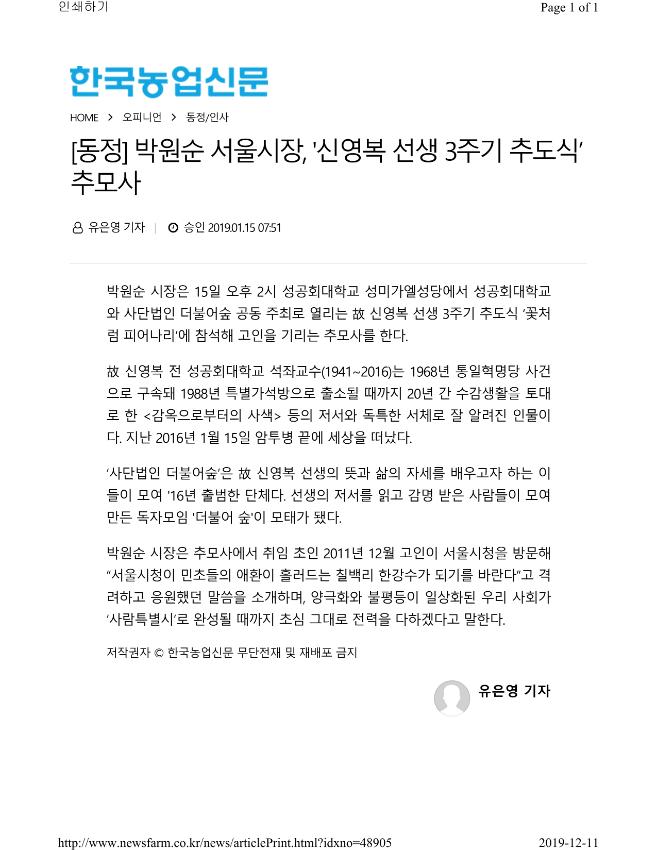 [동정] 박원순 서울시장, '신영복 선생 3주기 추도식’ 추모사 유은영 기자 you@newsfarm.co.kr 승인 2019.01.15 07:51 박원순 시장은 15일 오후 2시 성공회대학교 성미가엘성당에서 성공회대학교와 사단법인 더불어숲 공동 주최로 열리는 故 신영복 선생 3주기 추도식 ‘꽃처럼 피어나리’에 참석해 고인을 기리는 추모사를 한다. 故 신영복 전 성공회대학교 석좌교수(1941~2016)는 1968년 통일혁명당 사건으로 구속돼 1988년 특별가석방으로 출소될 때까지 20년 간 수감생활을 토대로 한 <감옥으로부터의 사색> 등의 저서와 독특한 서체로 잘 알려진 인물이다. 지난 2016년 1월 15일 암투병 끝에 세상을 떠났다. ‘사단법인 더불어숲’은 故 신영복 선생의 뜻과 삶의 자세를 배우고자 하는 이들이 모여 '16년 출범한 단체다. 선생의 저서를 읽고 감명 받은 사람들이 모여 만든 독자모임 '더불어 숲'이 모태가 됐다. 박원순 시장은 추모사에서 취임 초인 2011년 12월 고인이 서울시청을 방문해 “서울시청이 민초들의 애환이 흘러드는 칠백리 한강수가 되기를 바란다”고 격려하고 응원했던 말씀을 소개하며, 양극화와 불평등이 일상화된 우리 사회가 ‘사람특별시’로 완성될 때까지 초심 그대로 전력을 다하겠다고 말한다. 뉴스팜