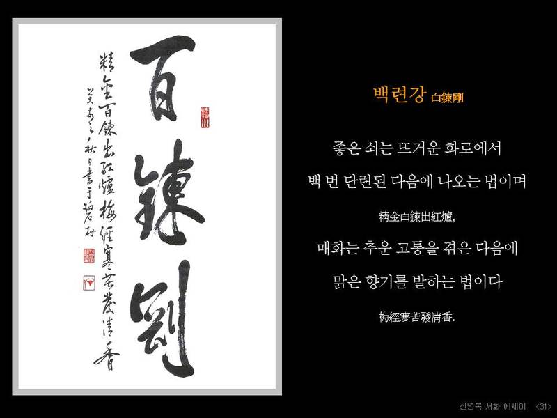 좋은 쇠는 뜨거운 화로에서 백 번 단련된 다음에 나오는 법이며 精金白鍊紅爐, 매화는 추운 고통을 겪은 다음에 맑은 향기를 발하는 법이다 梅經寒苦發淸香. 돌베개