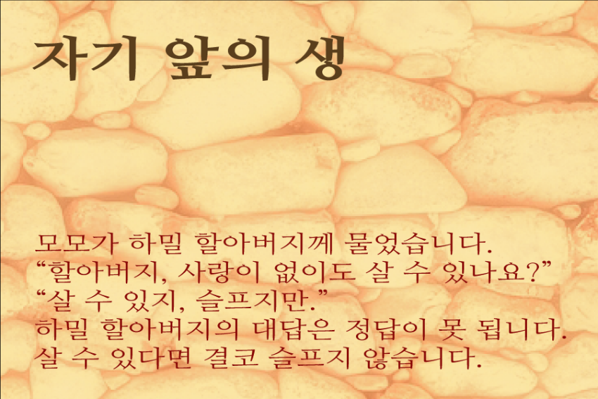 「자기 앞의 생」에서 모모가 하밀 할아버지에게 물었습니다. "할아버지, 사람이 사랑없이도 살 수 있나요?" "살 수 있지, 슬프지만." 하밀 할아버지의 대답은 정답이 못 됩니다. 살 수 있다면 결코 슬프지 않습니다. 생각하면 우리가 생명을 져버리지 않고 살아가고 있는 한 우리는 누군가를 사랑하고 있습니다. 그리고 사랑한다는 것은 기쁨만이 아닙니다. 슬픔도 사랑의 일부입니다. 마치 우리의 삶이 그런 것처럼. (인용위치 : "담론" 418쪽)