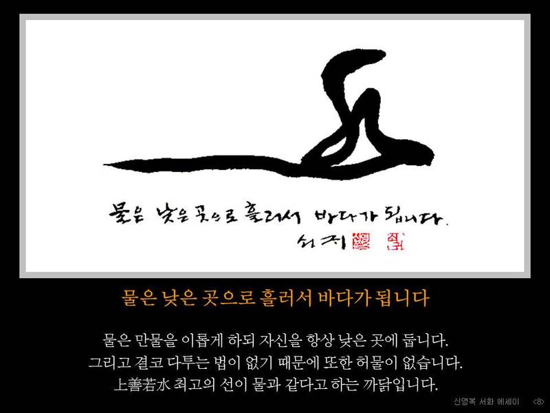 물은 낮은 곳으로 흘러서 바다가 됩니다 물은 만물을 이롭게 하되 자신을 항상 낮은 곳에 둡니다. 그리고 결코 다투는 법이 없기 때문에 또한 허물이 없습니다. 上善若水 최고의 선이 물과 같다고 하는 까닭입니다. 돌베개
