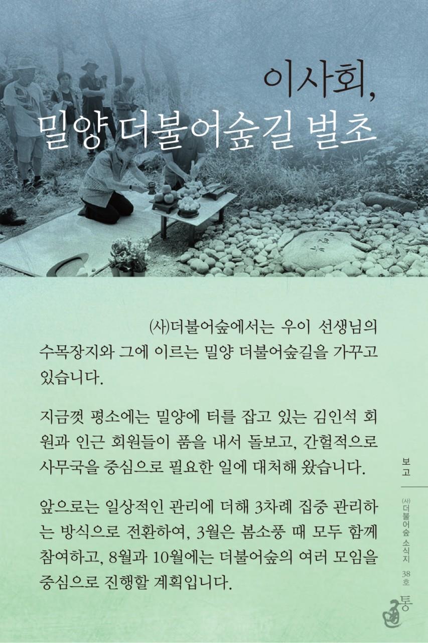 (사)더불어숲에서는 우이 선생님의 수목장지와 그에 이르는 밀양 더불어숲길을 가꾸고 있습니다.