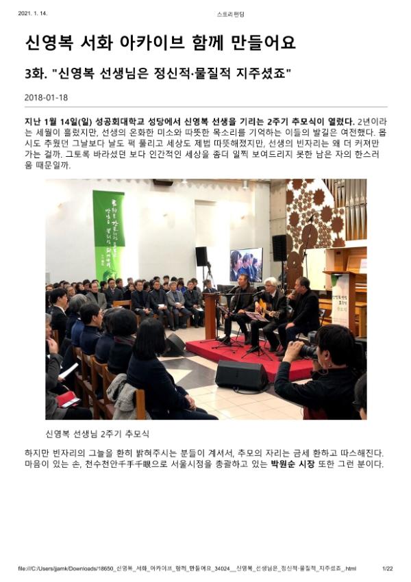 2018년 1월 14일(일) 성공회대학교 성당에서 신영복 선생을 기리는 2주기 추모식이 열렸다. 2년이라는 세월이 흘렀지만, 선생의 온화한 미소와 따뜻한 목소리를 기억하는 이들의 발길은 여전했다. 몹시도 추웠던 그날보다 날도 퍽 풀리고 세상도 제법 따뜻해졌지만, 선생의 빈자리는 왜 더 커져만 가는 걸까. 그토록 바라셨던 보다 인간적인 세상을 좀더 일찍 보여드리지 못한 남은 자의 한스러움 때문일까.