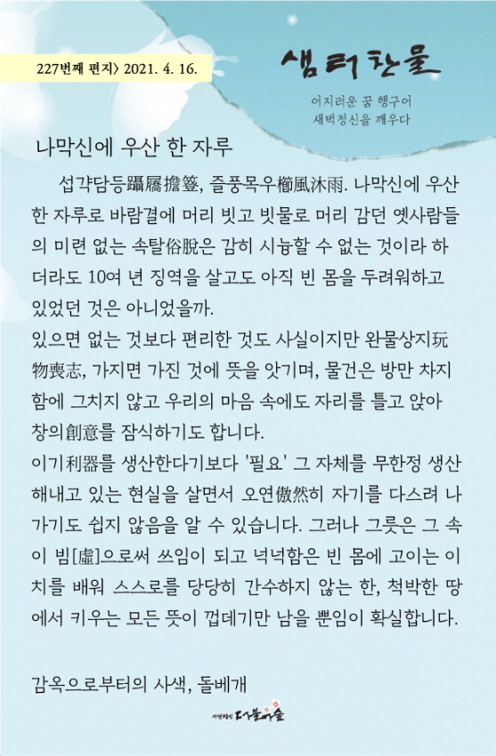 [소식지] 더불어숲 샘터찬물편지 227화