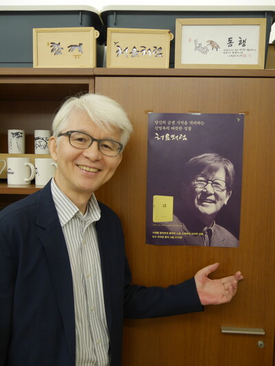 미얀마 민주화운동 후원 기금 마련을 위해 이번 전시회를 마련한 더불어숲 이사장인 김창남(61) 성공회대 신문방송학과 교수를 17일 서울 성북동 더불어숲 사무실에서 만났다.