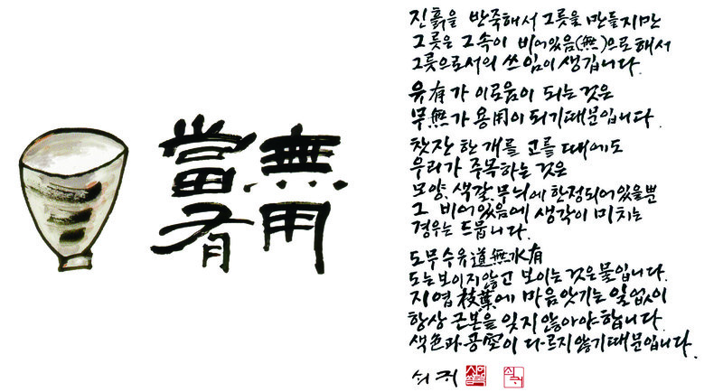 본문 : 수정 필요(한자 확인필요) 방서 : 진흙을 반죽해서 그릇을 만들지만 그릇은 그속이 비어있음(無)으로해서 그릇으로서의 쓰임이 생깁니다. 유有가 이로움이 되는 것은 무無가 용이 되기때문입니다. 찻잔 한 개를 고를 때에도 우리가 주목하는 것은 모양, 색갈, 무늬에 한정되어있을뿐 그 비어있음에 생각이 미치는 경우는 드뭅니다. 도무수유道無水有 도는 보이지않고 보이는 것은 물입니다. 지엽枝葉에 마음앗기는 일없이 항상 근본을 잊지않아야합니다. 색色과 공空이 다르지않기때문입니다.