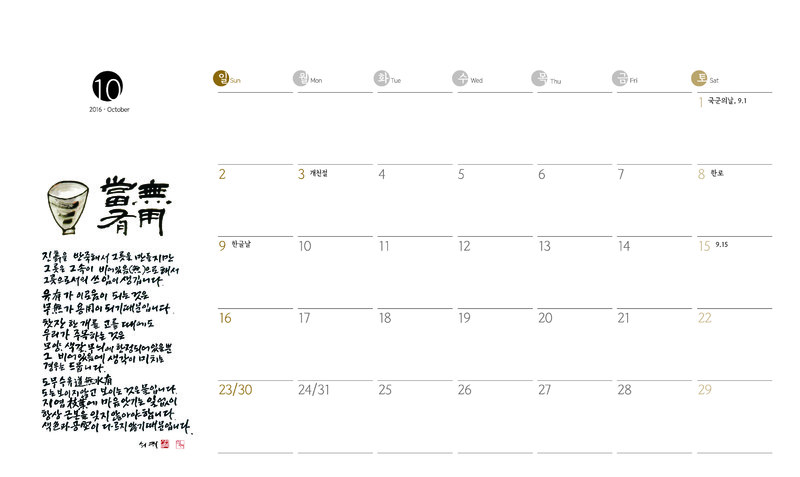 본문 : 수정 필요(한자 확인필요) 방서 : 진흙을 반죽해서 그릇을 만들지만 그릇은 그속이 비어있음(無)으로해서 그릇으로서의 쓰임이 생깁니다. 유有가 이로움이 되는 것은 무無가 용이 되기때문입니다. 찻잔 한 개를 고를 때에도 우리가 주목하는 것은 모양, 색갈, 무늬에 한정되어있을뿐 그 비어있음에 생각이 미치는 경우는 드뭅니다. 도무수유道無水有 도는 보이지않고 보이는 것은 물입니다. 지엽枝葉에 마음앗기는 일없이 항상 근본을 잊지않아야합니다. 색色과 공空이 다르지않기때문입니다.