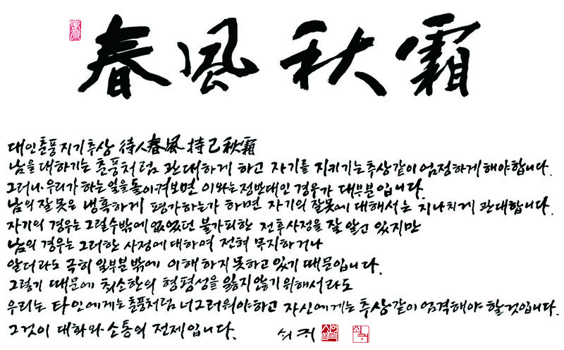 본문 : 春風秋霜 방서 : 대인춘풍지기추상待人春風持己秋霜 남을 대하기는 춘풍처럼 관대하게 하고 자기를 지키지는 추상같이 엄정하게 해야합니다. 그러나 우리가 하는 일을 돌이켜보면 이와는 정반대인 경우가 대부분입니다. 남의 잘못은 냉혹하게 평가하는가 하면 자기의 잘못에 대해서는 지나치게 관대합니다. 자기의 경우는 그럴수밖에 없었던 불가피한 전후사정을 잘 알고 있지만 남의 경우는 그러한 사정에 대하여 전혀 무지하거나 알더라도 극히 일부분밖에 이해하지 못하고 있기 때문입니다. 그렇기 때문에 최소한의 형평성을 잃지 않기 위해서라도 우리는 타인에게는 춘풍처럼 너그러워야 하고 자신에게는 추상같이 엄격해야 할것입니다. 그것이 대화와 소통의 전제입니다.
