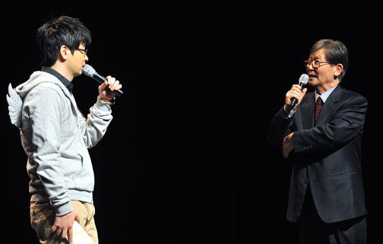 ㆍ“여럿이 함께 가면 길이 생긴다” 무대 위에서 이야기를 나누고 있는 탁현민 교수(왼쪽)와 신영복 교수. 두 사람은 스승과 제자 사이이기도 하다. 1월 25일 카타르 도하의 알 가라파 스타디움에서 아시안컵 4강전 한·일전이 열렸던 날, 탁현민 성공회대 겸임교수도 긴장했다. 축구경기의 승패 때문이 아니다. 축구 한·일전이 벌어졌던 날은 <주간경향>과 탁 교수가 함께 하는 장기 프로젝트 ‘탁현민의 시사콘서트’가 처음으로 선보이는 날이기도 했다. 시사콘서트는 처음부터 축구 한·일전에 맞서(?)는 ‘무한도전’이었던 것. 시사 강연과 인디 밴드의 공연이 잘 어우러질 수 있을까 하는 우려는 공연 내내 계속됐다. 하지만 우려는 우려에 불과했다. ‘시사콘서트’라는 특별한 형식의 공연은 관객들에게 뜨거운 호응을 받았다. 신영복 교수 “출소 이후 진짜 자유 고민” 1월 25일 저녁 7시부터 8시까지 서울 정동 이화여고 100주년기념관(430석 규모)에는 400명을 훌쩍 뛰어넘는 관객들이 몰려왔다. 관객석이 거의 차서 공연을 준비하던 스태프들이 정신없이 뛰어다녀야 했다. 공연 시작 30분 전부터 티켓 교환처에는 길게 줄이 늘어서기 시작했다. 티켓을 교환하기 위해 줄을 선 관객들 사이에서는 “이렇게 사람이 몰려들 줄 몰랐다”며 놀라는 모습들이 보였다. 김창남·김진업·박경태 성공회대 교수가 참여하고 있는 직장인 밴드 ‘더숲 트리오’. 예약자들이 공연장에 모두 들어온 8시 15분, 공연장의 불이 꺼졌다. 무대에 설치된 화면에 이날 사회를 맡은 탁현민 교수의 소개 영상이 흘러나왔다. 마치 콘서트장에서나 볼 수 있었던 재기 넘치고 흥겨운 영상에 관객들은 박수와 환호로 화답했다. 입담 좋은 ‘일단은, 준석이들’ 밴드가 들썩이는 공연장 분위기를 한껏 달아오르게 했다. 기타를 치고 타악기를 두드리면서 관객들의 박수와 환호성을 이끌어냈다. “탁 교수가 트위터에 홍보를 할 때 우리를 ‘등’이라고 소개했는데, 우리의 이름은 ‘일단은, 준석이들’이다(탁 교수가 트위터로 시사콘서트 홍보를 할 때 ‘더숲트리오’ ‘좋아서 하는 밴드’ 등이 출연한다고 했던 글을 이야기함)”라는 우스개에 관객들의 웃음이 터졌다. 오프닝 공연이 끝나자 탁 교수가 천사 날개를 등에 달고 무대에 등장했다. 관객들이 박수와 웃음으로 맞이했다. ‘현빈 대신 현민’이라고 쓴 종이를 들고 온 관객의 모습이 무대 화면에 비치자 관객석은 웃음과 환호성으로 들썩였다. 1만3000여명의 트위터 팔로어를 가지고 있는 탁 교수의 인기를 보여주는 장면이었다. 첫 번째 시사콘서트는 400여개의 객석을 모두 채울 만큼 큰 호응을 얻었다. 탁 교수가 “관객들에게 줄 선물”이라며 무대에 ‘안상수표 폭탄’인 ‘보온병’을 내놓았다. 탁 교수는 “눈에 보이는 것 이상을 이야기하고, 상상력을 자극한다”는 말로 안상수 한나라당 대표를 평가했다. 이날 탁 교수가 관객석에 던진 질문은 “이명박 대통령 때문에 나의 삶이 바뀐 것”이었다. 탁 교수는 트위터에 올라왔던 “누구도 그보다 낫다. 사람에 대한 이해가 넓어졌다” 등의 글을 소개했다. 탁 교수의 유머에 관객들은 마냥 즐겁게 웃었다. 이날 강연자인 신영복 성공회대 석좌교수가 소개됐다. 보통의 강연장과는 다른 분위기에 “이런 분위기인지 몰랐다. 제자이자 같은 학교 선생인 탁 교수에게 낚인 것 같다”면서 웃었다. 함께 웃고 떠들던 공연장은 신 교수의 등장으로 일순간 차분해졌다. 이날 신 교수는 “자유는 ‘자기의 이유로 걸어가는 것’”이라는 주제의 강연을 관객들에게 펼쳐놓았다. 신 교수의 강연이 시작되자 ‘노트에 무언가를 적는 관객’ ‘휴대전화로 동영상을 촬영하는 관객’이 보였다. 관객들은 신 교수의 말 한마디 한마디에 집중하기 시작했다. 강연이 시작되자 왁자지껄했던 공연장은 대학 강의실처럼 조용한 공간으로 변했다. “감옥에 있을 때는 자유는 무조건 출소였다. 일단 감옥만 벗어나면 자유라고 생각했다. 그런데 출소 이후에 진짜 자유가 무엇인지를 생각하게 됐다”면서 “오늘은 여러분과 자유에 대해 이런 저런 생각을 같이 공유해보는 시간이었으면 좋겠다”며 강연을 시작했다. 시사콘서트의 고정을 노리는 ‘일단은, 준석이들’ 밴드는 재미있는 입담으로 관객들의 사랑을 받았다. 신 교수는 컴퓨터에 준비해온 강연 내용을 무대 화면에 비춰가면서 강연을 이어나갔다. 20년 동안 감옥에서 겪었던 다양한 경험을 곁들이면서 자칫 무거울 수 있는 강연의 완급을 조절했다. ‘나무가 혼자 있을 때보다 숲속에 있을 때 진정한 자유가 있는 것’이라고 결론을 내렸다. ‘연대’와 ‘관계’의 중요성을 강조한 것. “감옥은 나의 대학이었다. 처음 나도 근대적인 문맥에 갇혀 있었다. 감옥에 있는 재소자를 대상화하고 타자화하고 분석했다. 그런데 그 사람들과 긴긴 밤을 서로 이야기하면서 (근대적인 문맥을) 많이 깼고, 그들을 차츰 이해하게 됐다. 공감하게 된 것이다.” 알아서 관람료 내는 후불제 공연 강연 예정시간 50분을 훌쩍 넘어 1시간이 지나갔다. 신 교수는 “여럿이 함께 가면 길이 생긴다. 자유는 성찰이며 변
