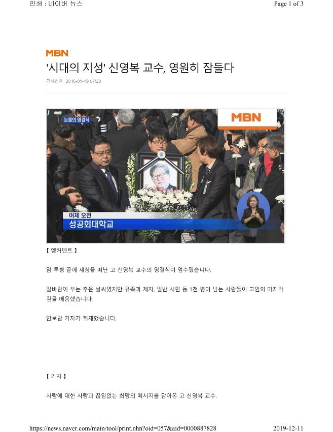 【 앵커멘트 】 암 투병 끝에 세상을 떠난 고 신영복 교수의 영결식이 엄수됐습니다. 칼바람이 부는 추운 날씨였지만 유족과 제자, 일반 시민 등 1천 명이 넘는 사람들이 고인의 마지막 길을 배웅했습니다. 안보람 기자가 취재했습니다. 【 기자 】 사람에 대한 사랑과 끊임없는 희망의 메시지를 담아온 고 신영복 교수. ▶ 인터뷰 : 고 신영복 / 성공회대 석좌교수 (2006년) - "만나는 사람들을 우리 사회가 담겨 있는 책같이 역사가 담겨 있는 것으로 아주 소중하게 서로 대화했다는 점…." 칼바람이 부는 영하 날씨에도 고인의 마지막 길을 함께하려는 사람들의 발길이 이어졌습니다. ▶ 인터뷰 : 최선희 / 인천 송도 - "날씨가 추운 건 별로 상관이 없었고요. 아이들과 함께 여기 와서 어떻게 살아야 하는지를 보여주고 싶었어요." 영결식장은 물론 별도로 마련된 강당까지 1천여 명의 사람들로 가득 찼습니다. 고인을 회상하는 추도사가 이어지자 애도와 추모의 감정은 더 짙어집니다. ▶ 인터뷰 : 탁현민 / 성공회대 교수 - "(선생님의) 마지막 말씀을 전하는 것으로 이야기를 마치겠습니다. 울지마라, 울지 마요. 나중에 다시 만나면 되지." 사형수에서 시대의 지성으로 굴곡진 삶을 살아온 신영복 교수는 많은 이들의 눈물 속에 영면에 들었습니다. ▶ 인터뷰 : 김광명 / 경기 안양시 - "저희와 함께 해주셔서 정말 감사하고, 고맙다는 말씀 꼭 드리고 싶습니다." MBN뉴스 안보람입니다. 영상취재 : 박세준 기자 영상편집 : 이재형 MBN