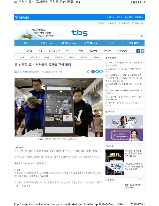 【 앵커멘트 】 우리 시대 대표적인 지식인 중 한 명인, 신영복 성공회대 석좌교수가 지난 15일 세상을 떠났습니다. 타계 소식이 전해진 직후부터 고 신영복 교수의 저술에 대한 독자들의 관심이 크게 높아졌습니다. 출판평론가 김성신씨가 전해드립니다. 【 기자 】 한 온라인서점 집계를 보면, 고 신영복 교수의 저서는 타계 소식이 알려지기 직전 판매된 것과 비교했을 때 13배가 넘게 팔리고 있습니다. 이가운데 '감옥으로부터의 사색'이 가장 많이 팔리고 있고, 이어 '담론', '강의', '더불어 숲', '나무야 나무야' 순입니다. 신영복 교수의 대표작이라고 할 수 있는 '감옥으로부터의 사색'은 스무 번의 사계절을 감옥에서 겪어낸 느낌을 적고 있는 책이지만, 사람과 세상에 대한 애정과 따뜻함을 담고 있어 우리에게 큰 감동을 남겼습니다. 지난해 4월 출간한 '담론 : 신영복의 마지막 강의'는 고인 생전의 마지막 저술이 됐습니다. 이 책은 동양고전 독법을 통해 '관계론'의 사유로 세계를 인식하면서, 고전을 현재의 맥락에서 해석한 내용의 책입니다. 신영복 교수가 쓴 미발표 원고도 새 책으로 나올 예정입니다. 출판사는 유가족과 논의해 '공부란 무엇인가'와 수필집을 출간하겠다고 밝혔습니다. '공부란 무엇인가'는 공부를 화두로 사색하고 강의했던 기록을 담은 책이며, 수필집은 자신의 감옥 시절에 대한 소회가 담긴 책으로 알려지고 있습니다. 지금까지 출판계 소식 전해드렸습니다.■ tbs교통방송